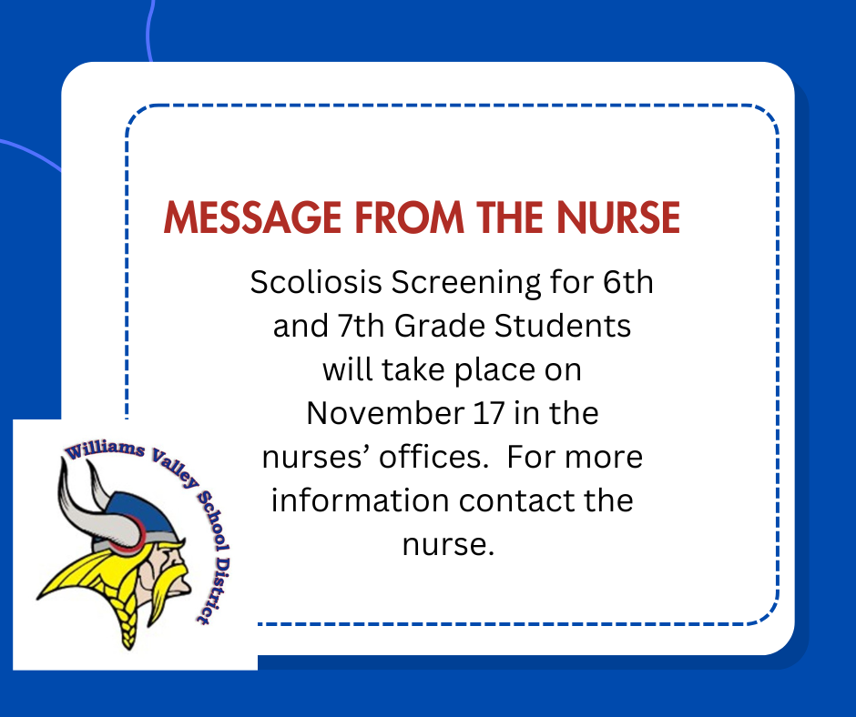 Scoliosis Screenings November 17 - Scoliosis screenings for 6th and 7th grade students in nurses' offices Published November 5, 2025 Print