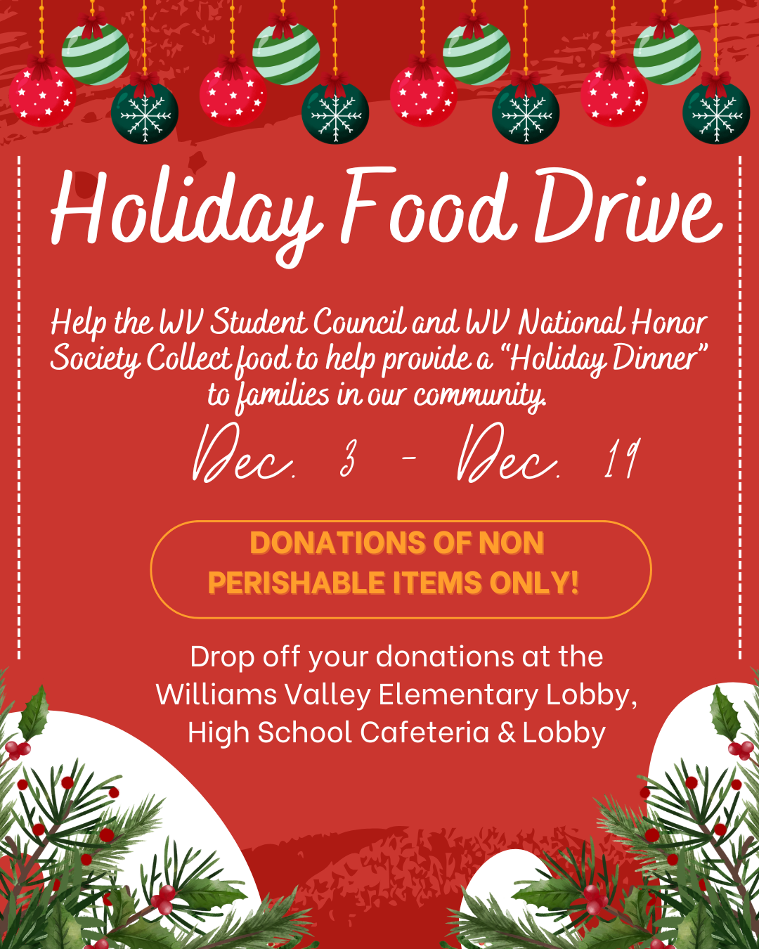 Help the WV Elementary Student Council and WV National Honor Society Collect food to help provide a “Holiday Dinner” to families in our community.